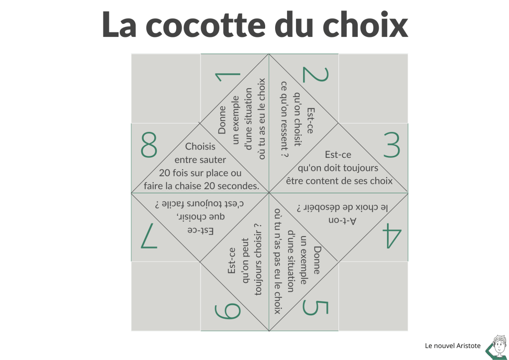 Alors réfléchissons sur le choix, c’est quoi, choisir ? Pour lancer la discussion tout en restant dans le thème, utilisez cette cocotte du choix, à télécharger